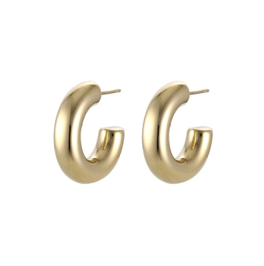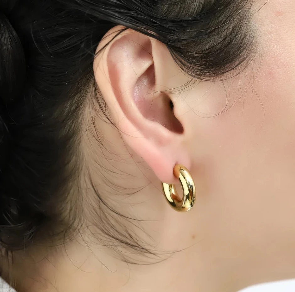 Masivní kruhové náušnice z chirurgické oceli. Náušnice jsou "duté" a i přes jejich rozměry se pohodlně nosí. Povrch náušnic je pozlacený technologií PVD. Vnější průměr náušnic 30mm, šířka 10mm. Náušnicové zapínání je na puzety.