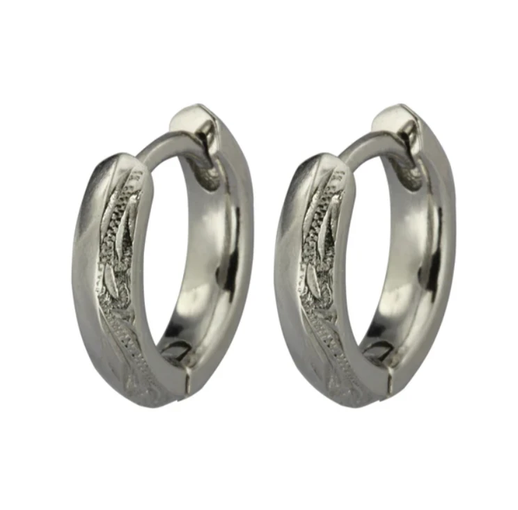 Moderní náušnice z chirurgické oceli. Povrch náušnic je leštěný s gravírováním. vnější průměr náušnic 13mm, vnitřní průměr 9mm. Kroužky jsou široké 3mm. Zapínání náušnic je na kloub. Uvedená cena platí za pár.