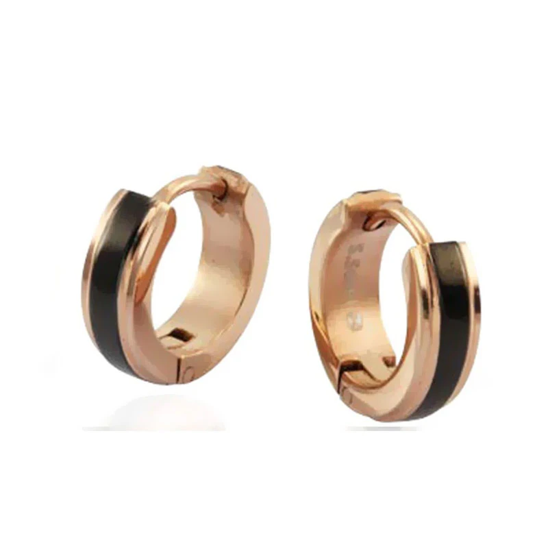 Náušnice kroužky z chirurgické oceli. Leštěný povrch náušnic kombinuje černou barvu s barvou růžového zlata. Náušnice jsou široké 4mm, vnější průměr náušnic 13mm. Náušnicové zapínání je na kloub.