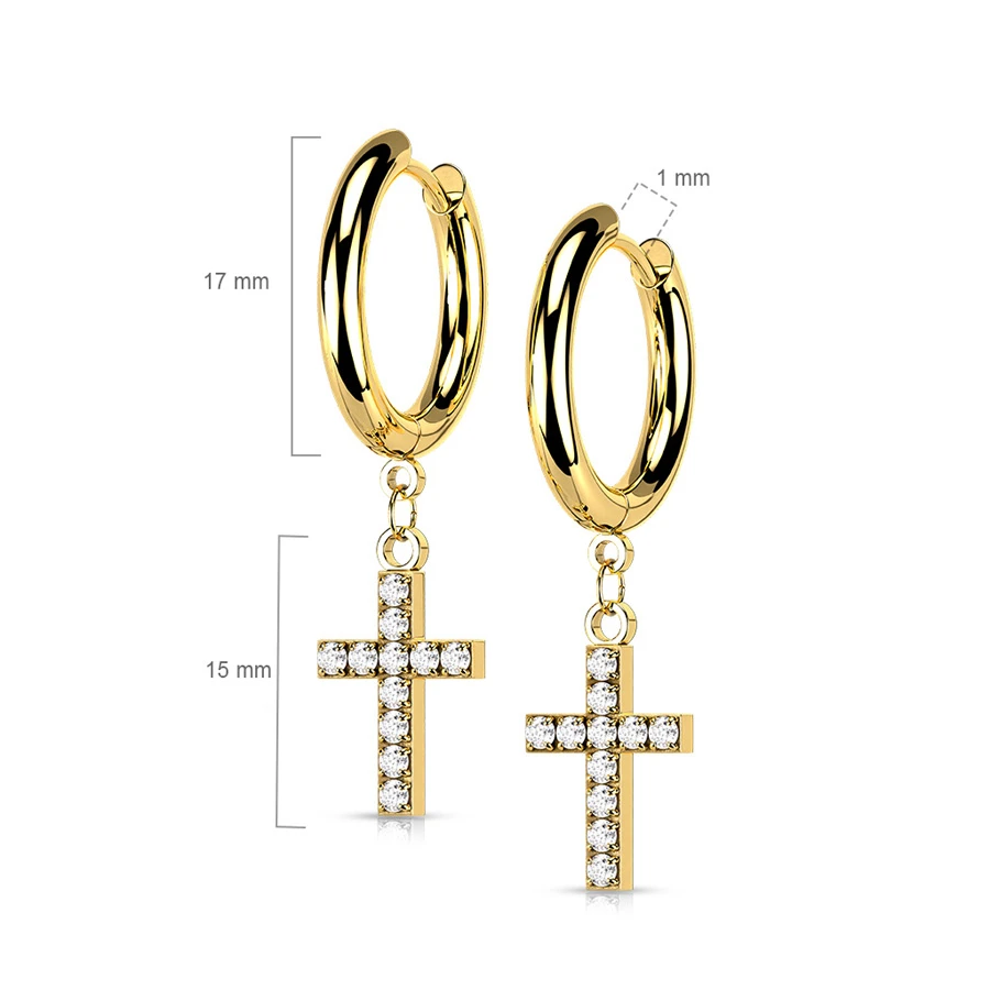Ocelové náušnice kroužky s křížky. Na kroužku je zavěšený křížek se zirkony. Vnější průměr kroužku 17mm, celková délka náušnice 32mm. Povrch náušnic je leštěný. Uvedená cena platí za pár náušnic.