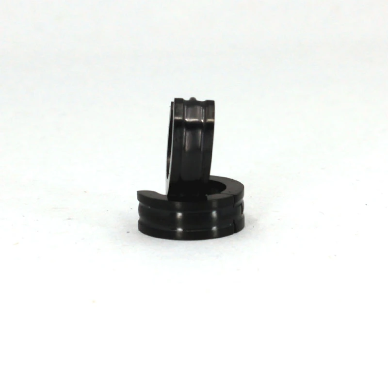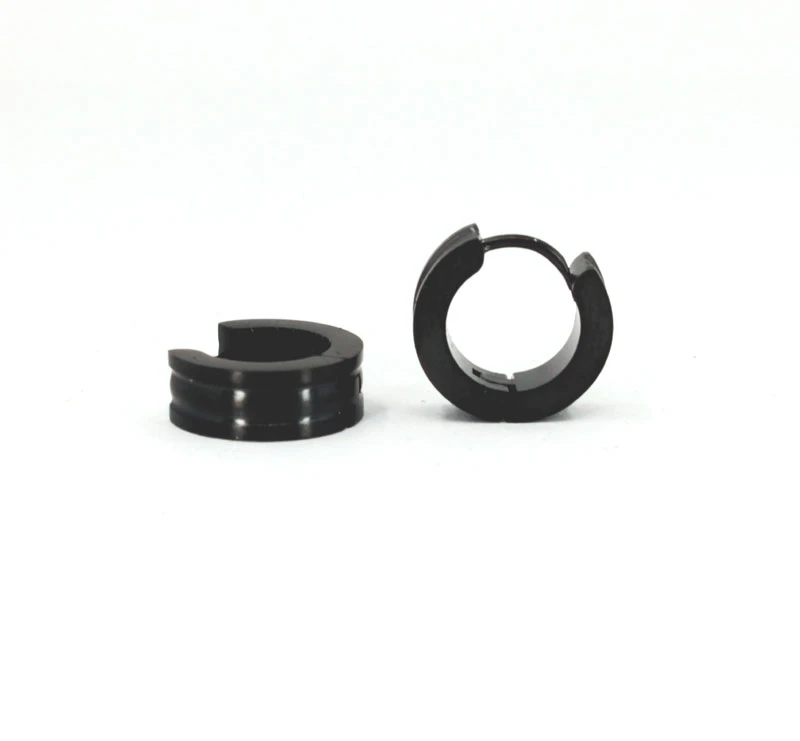 Náušnice kroužky z chirurgické oceli. Povrch náušnic je upravený černou PVD barvou. Náušnice jsou široké 5mm, vnější průměr náušnic 13mm. Náušnicové zapínání je kloubové.