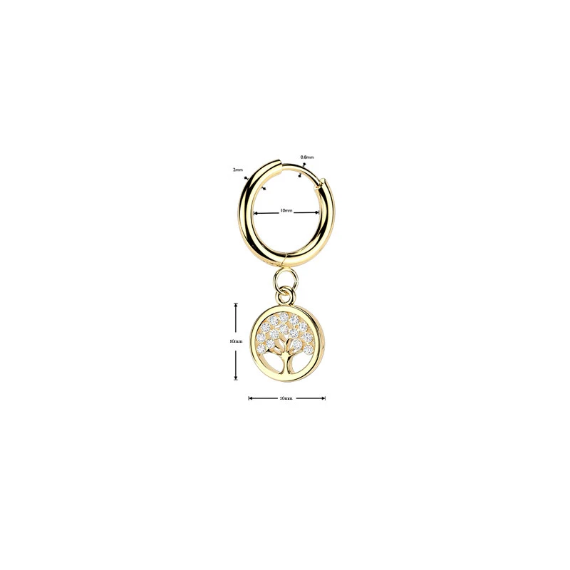 Kruhové náušnice s ozdobou stromu života. Povrch náušnic je leštěný, ozdoba se stromem života je osazená čirými zirkony. Vnitřní průměr kroužku 10mm, vnější průměr 14mm. Ozdoba se stromem života má průměr 10mm. Celková délka náušnice 27mm. Náušnicové zapínání je kloubové. Uvedená cena platí za pár.