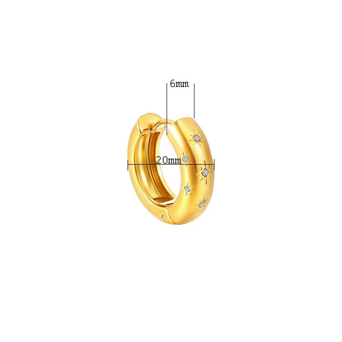 Náušnice kroužky z chirurgické oceli. Náušnice mají leštěný povrch a jsou ozdobené zirkony. Vnější průměr náušnic 20mm, šířka náušnic 5mm. Náušnicové zapínání je kloubové.