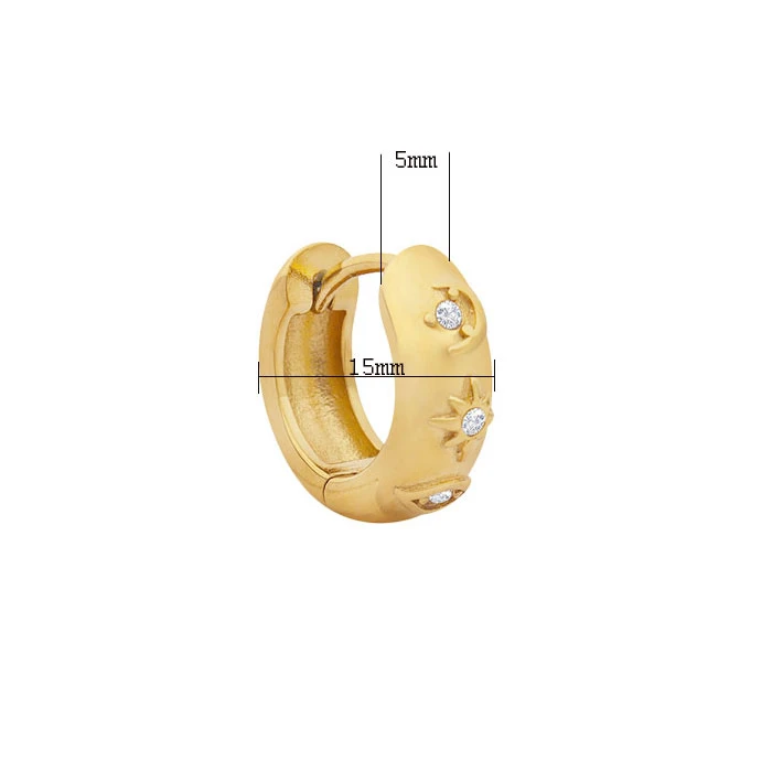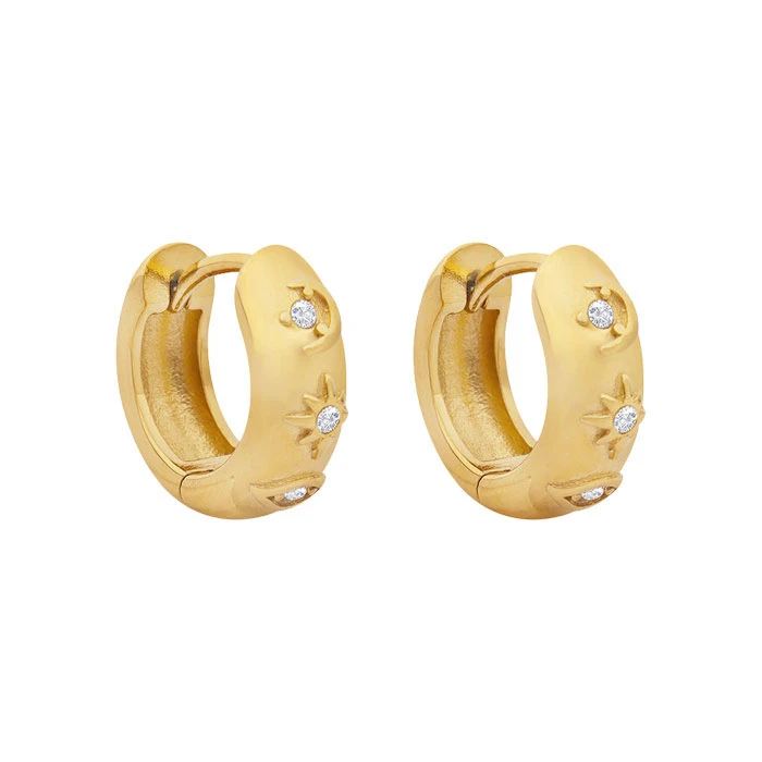 Náušnice kroužky z chirurgické oceli. Náušnice jsou ozdobené symboly měsíce a hvězd. Vnější průměr náušnic 15mm, šířka náušnic 5mm. Náušnicové zapínání je kloubové.