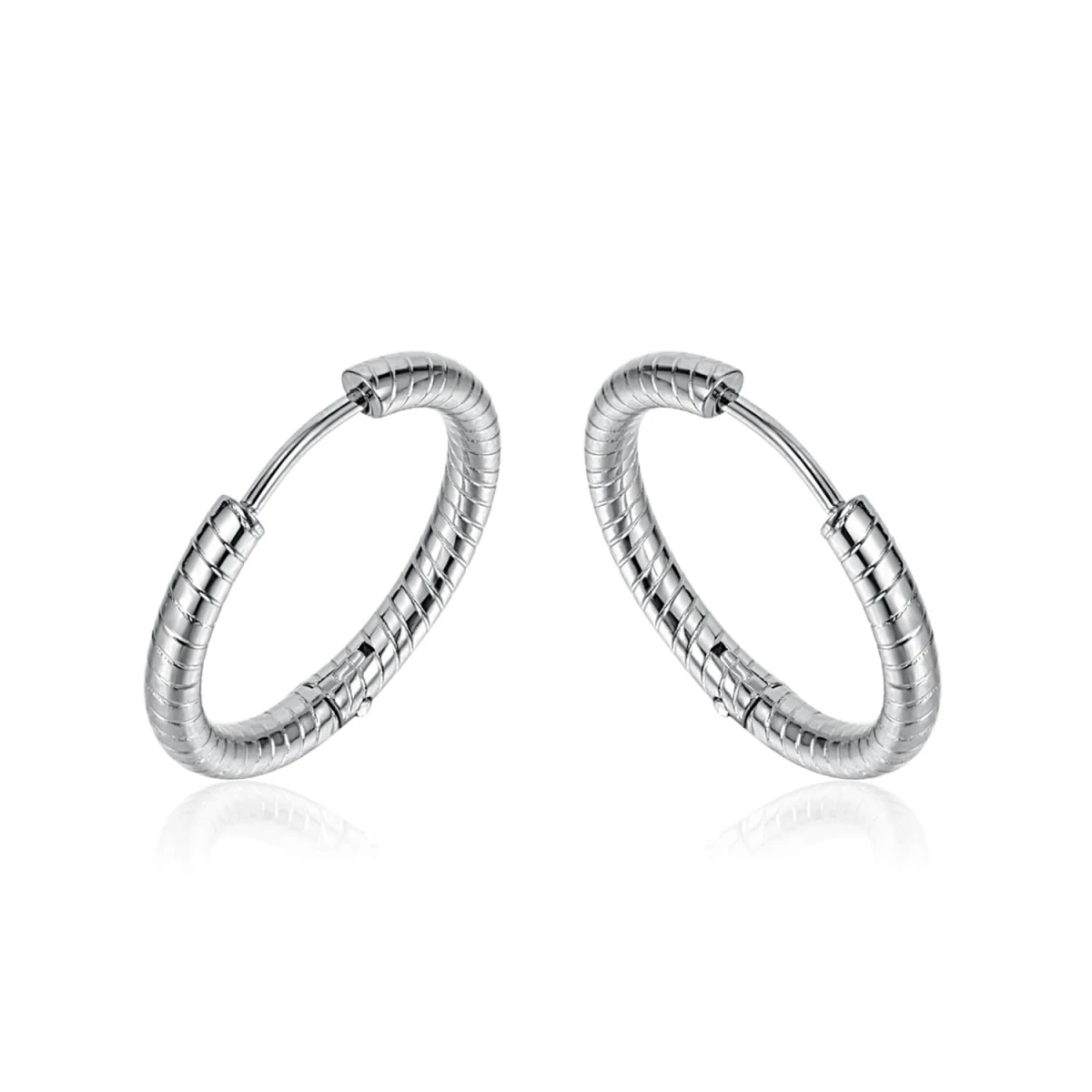 Kruhové náušnice z chirurgické oceli. Povrch náušnic je leštěný se vzorem. Náušnice jsou široké 2,3mm. Zapínání náušnic je kloubové. Uvedené průměry náušnic jsou vnější.