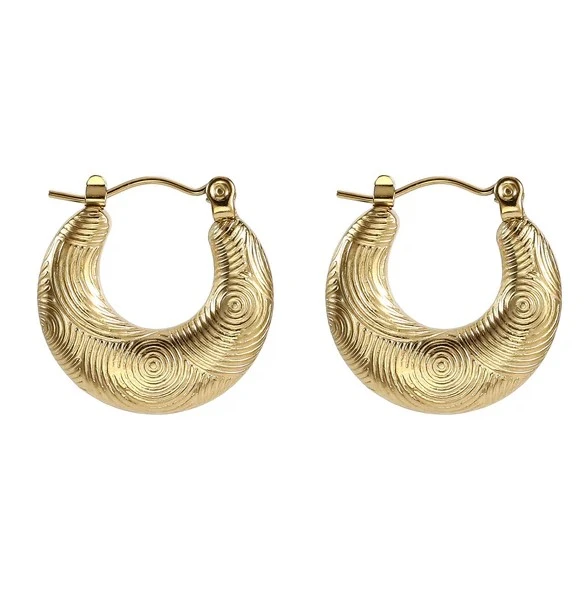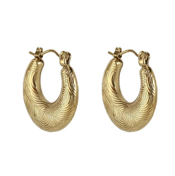 Náušnice z chirurgické oceli kruhového tvaru. Pozlacený povrch náušnic je zdobený gravírovaným vzorem. Náušnice mají vnější průměr 20mm. Náušnicové zapínání je na francouzský zámek.