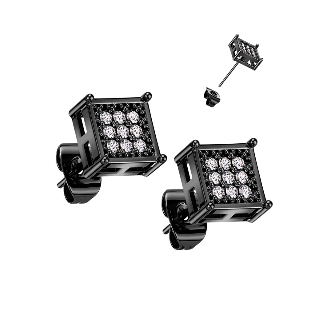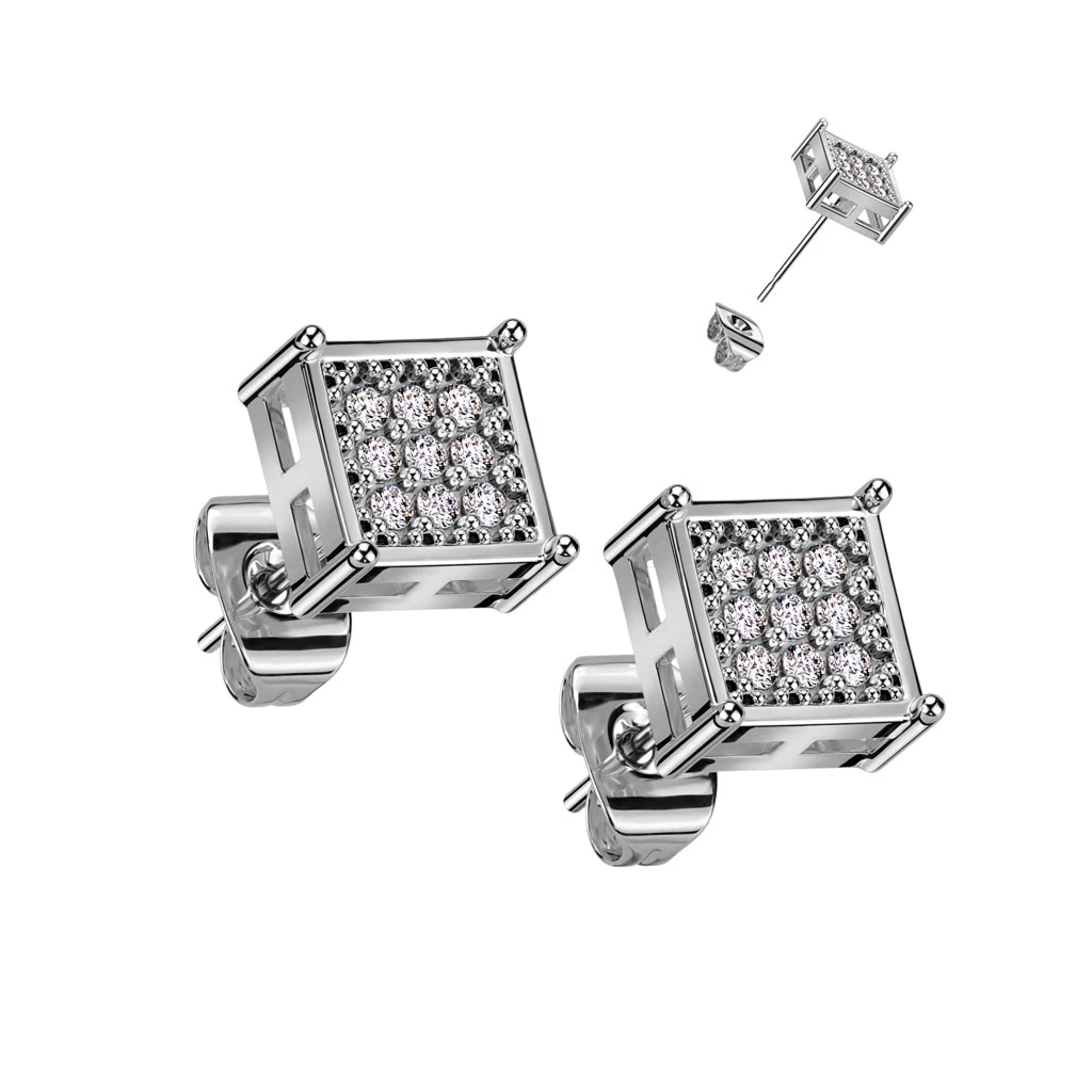 Ocelové náušnice pecky se zirkony. Povrch náušnic je leštěný. Náušnicové zapínání je na puzety. Čtvercové náušnice pecky velikosti 8x8mm.