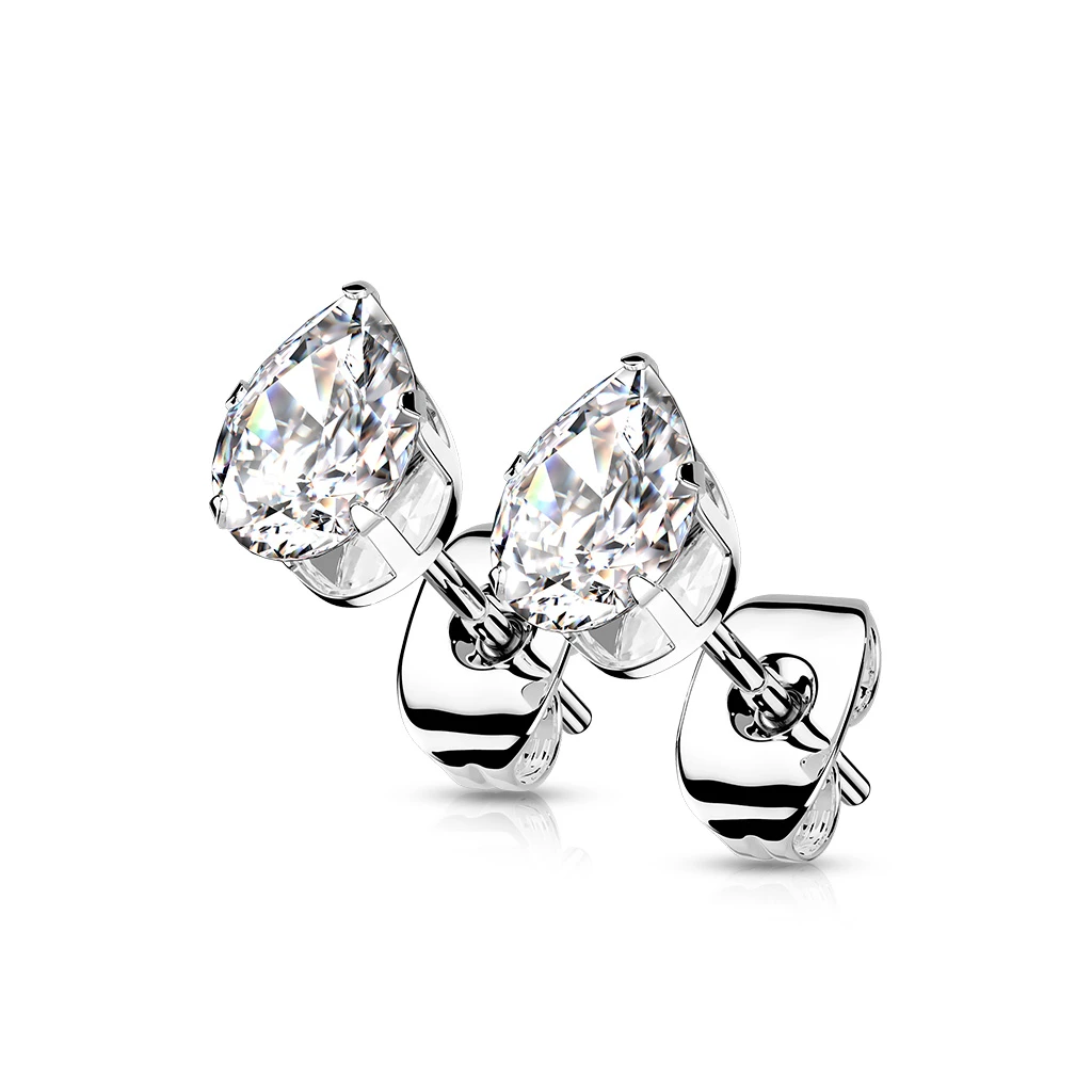 Náušnice pecky z chirurgické oceli se zirkonem ve tvaru kapky o rozměru 3x5mm. Náušnicové zapínání je na puzetky.