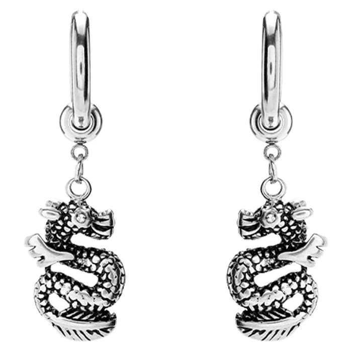 Visací náušnice z chirurgické oceli s drakem. Náušnice tvoří kroužek s vnějším průměrem 15mm, na kterém je zavěšený přívěsek draka dlouhý 25mm. Celková délka náušnice 42mm. Náušnicové zapínání je kloubové.