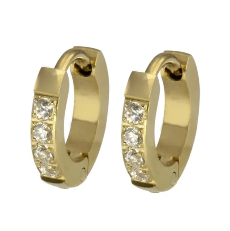 Náušnice malé kroužky z chirurgické oceli. Náušnice jsou ozdobené třpytivým zirkony. povrch náušnic je pozlacený technologií PVD. Vnější průměr náušnic 10mm, vnitřní průměr 7mm. Šířka náušnic 2mm. Cena je uvedena za pár.