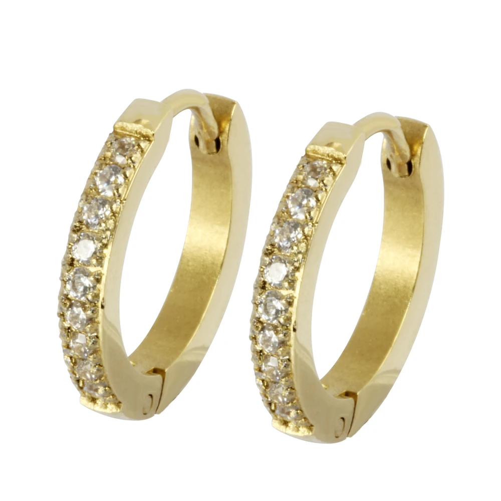 Náušnice větší kroužky z chirurgické oceli. Povrch náušnice je pozlacený technologií PVD. Náušnice jsou ozdobené třpytivým zirkony. Vnější průměr náušnic 15mm, vnitřní průměr 11mm. Šířka náušnic 2mm. Cena je uvedena za pár.