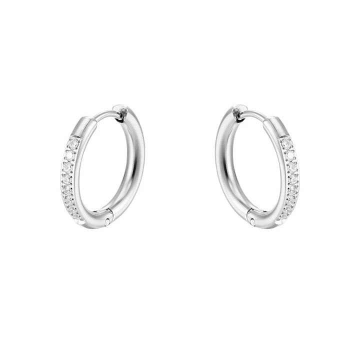 Dámské náušnice kroužky z chirurgické oceli se zirkony. Povrch náušnic je leštěný. Náušnicové zapínání je kloubové. Vnější průměr náušnic 16mm, šířka 2,5mm.