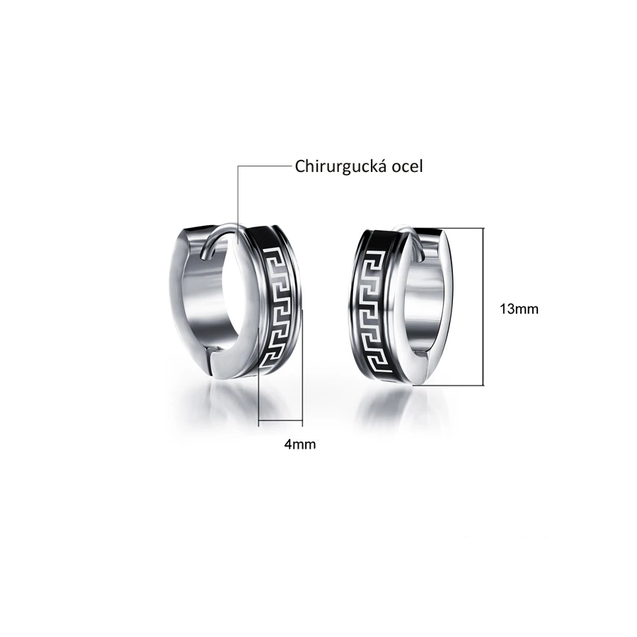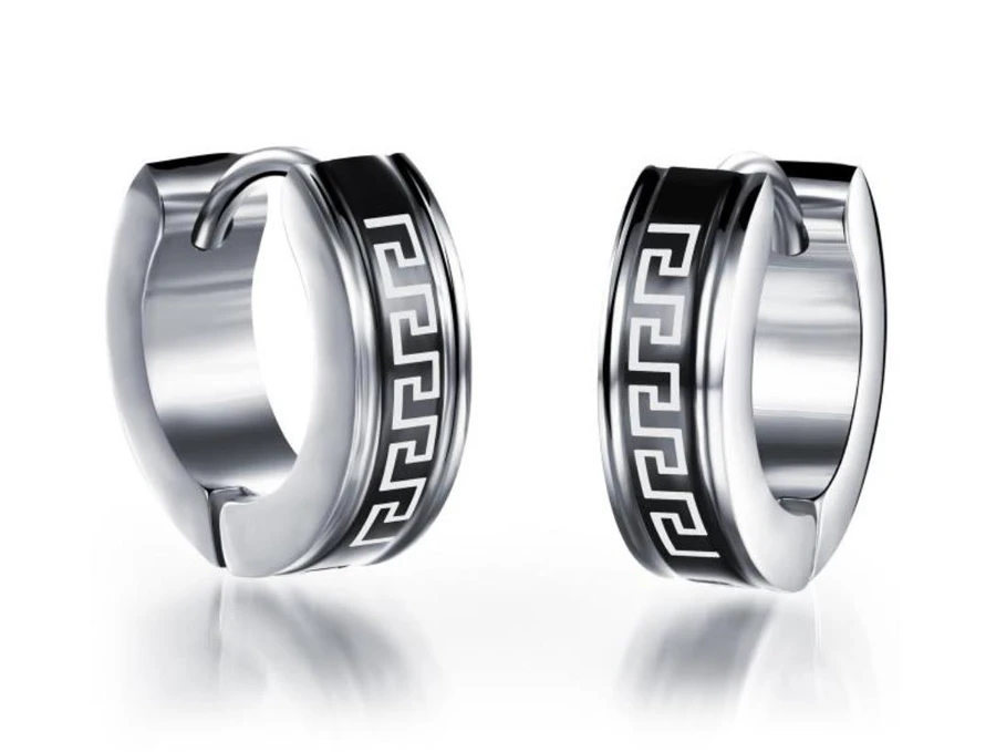 Náušnice z chirurgické oceli kroužky s černým proužkem a průběžným pásovým ornamentem Meandr. Ornament Meandr je odvozený od klikatého tvaru toku stejnojmenné řeky Menderes v dnešním Turecku. Tento ornament se ke zdobení šperků využívá již po staletí.