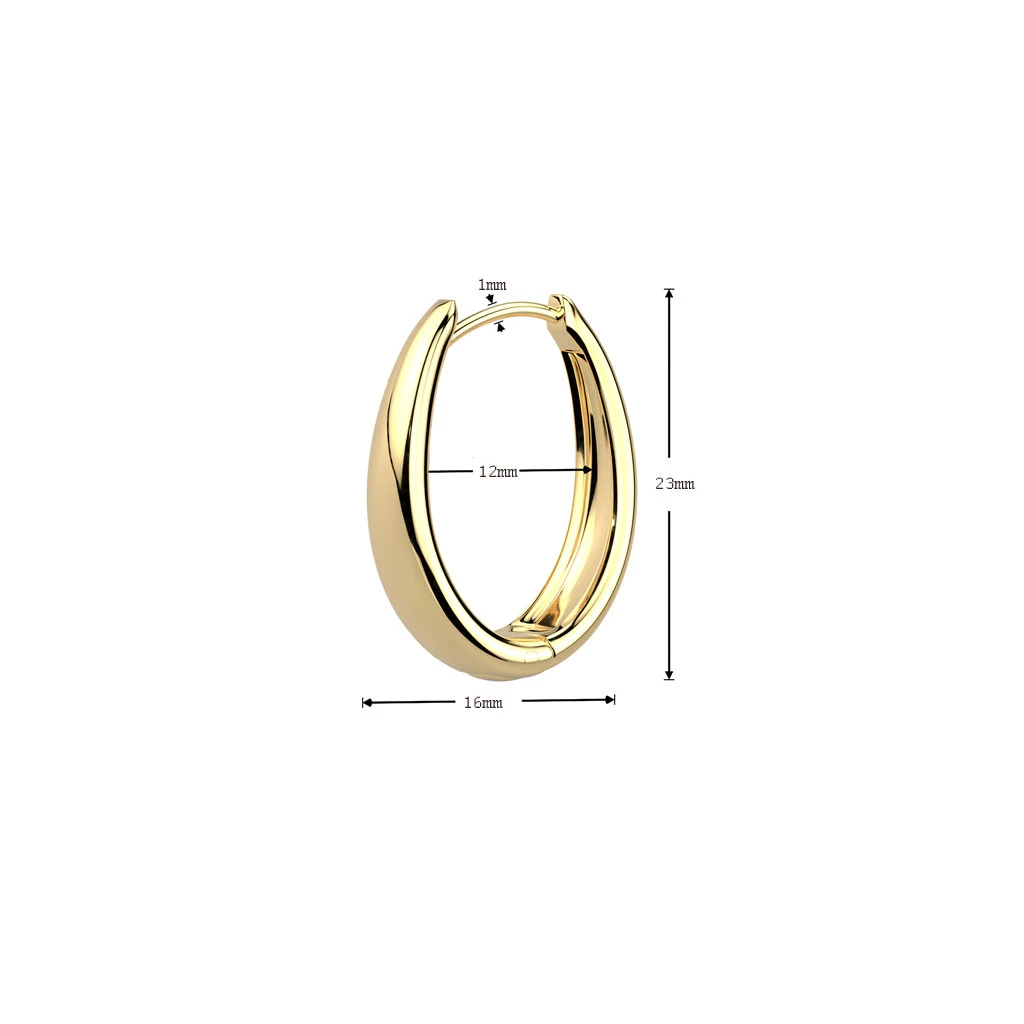Visací náušnice z chirurgické oceli oválného tvaru. Povrch náušnic je leštěný. Náušnicové zapínání je kloubové. Rozměry náušnic najdete vyobrazené na podpůrné fotografii.