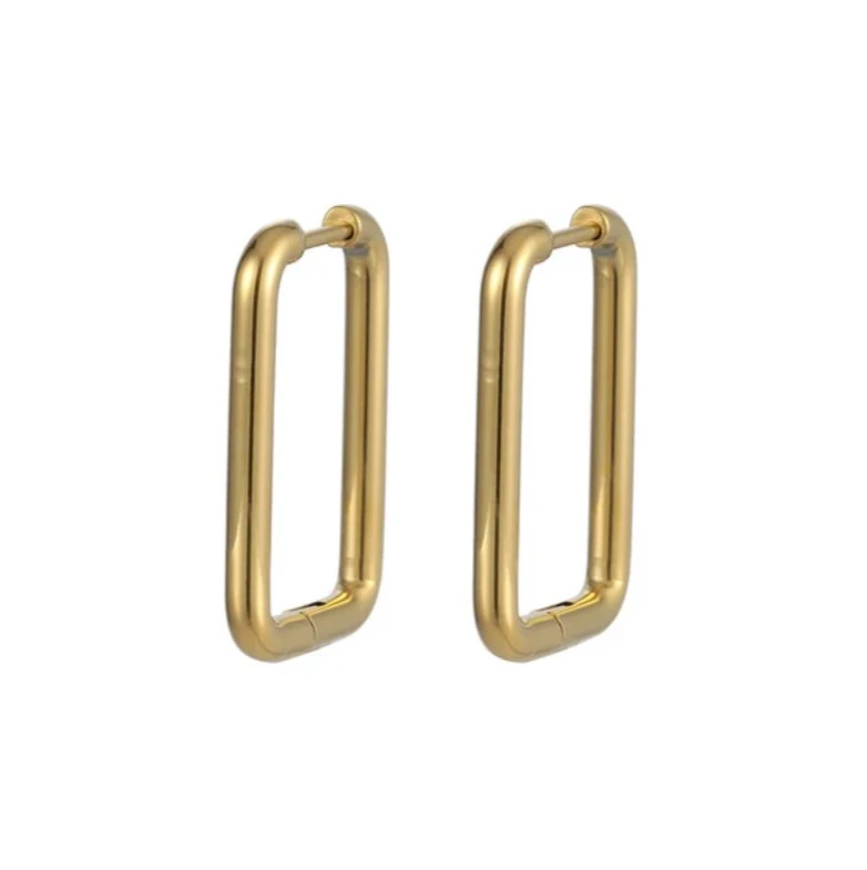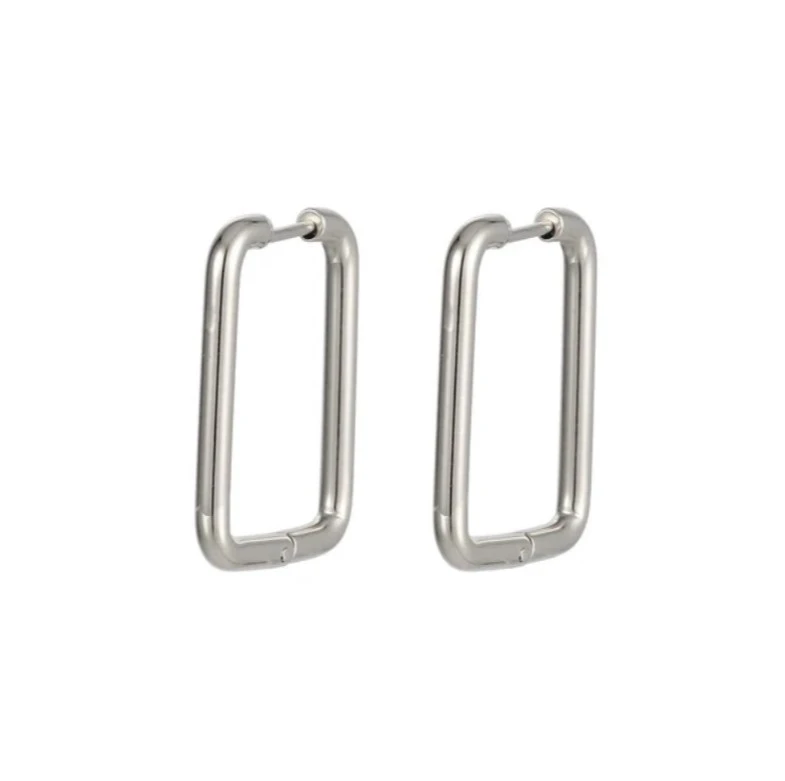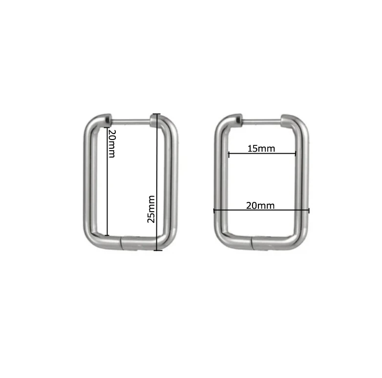 Náušnice z chirurgické oceli visací ve tvaru obdélníku. Povrch náušnic je leštěný. Náušnice jsou široké 20mm, dlouhé 25mm. Všechny rozměry náušnic najdete na podpůrné fotografii. Zapínání náušnic je kloubové. Cena je uvedena za pár.