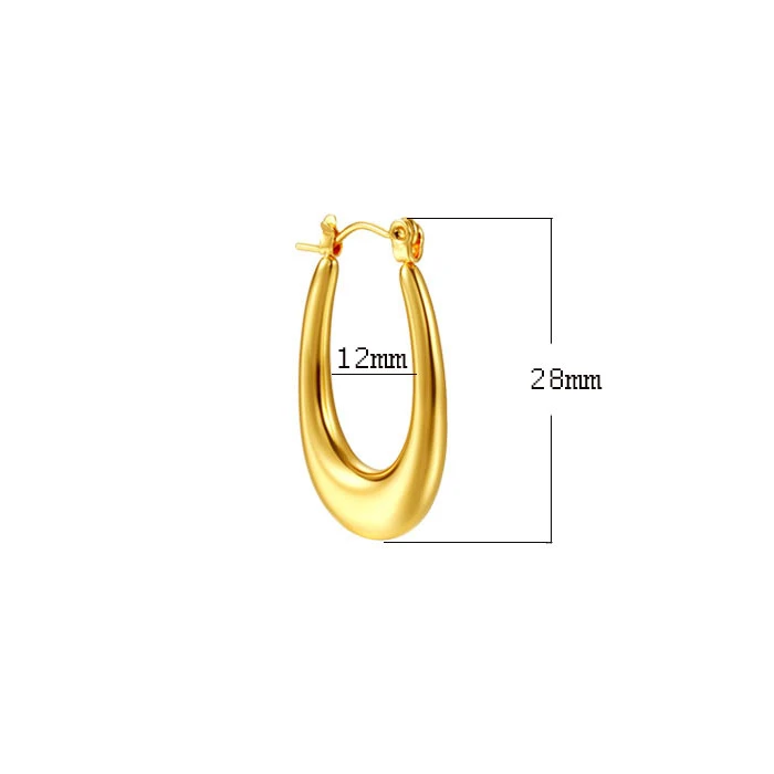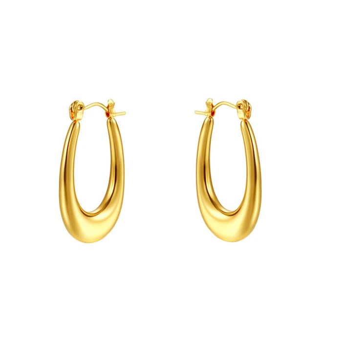Visací náušnice z chirurgické oceli oválného tvaru. Povrch náušnic je leštěný pozlacený technologií PVD. Náušnicové zapínání je na francouzský zámek. Velikost náušnic 28mm najdete zobrazený na podpůrné fotografii.