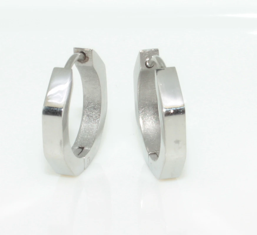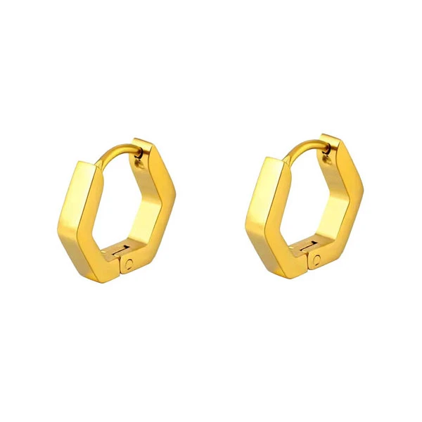 Náušnice z chirurgické oceli ve tvaru šestihranu. Náušnice mají leštěný povrch. Vnitřní průměr náušnic 12mm, vnější rozměry 16x16mm, šířka 3mm. Náušnicové zapínání je kloubové.