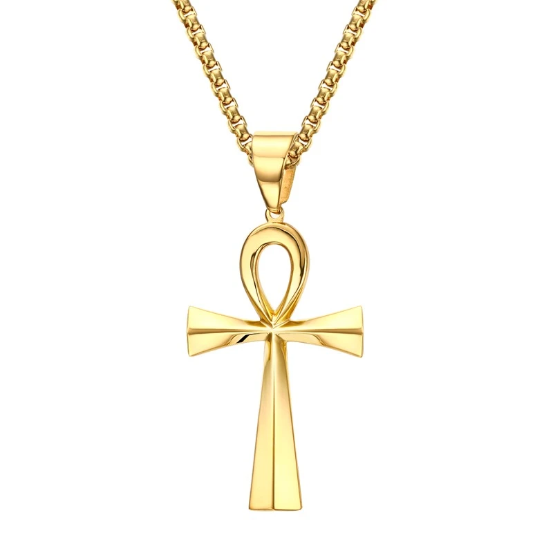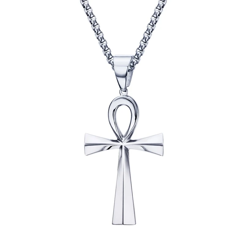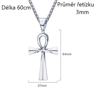 Přívěsek z chirurgické oceli nilský kříž. Nilský kříž je hieroglyf z Egypta a jeho význam je pozemský a věčný život. Povrch kříže je leštěný. Rozměr přívěšku 64x37 mm. K přívěsku náleží řetízek z chirurgické oceli dlouhý 60 cm.