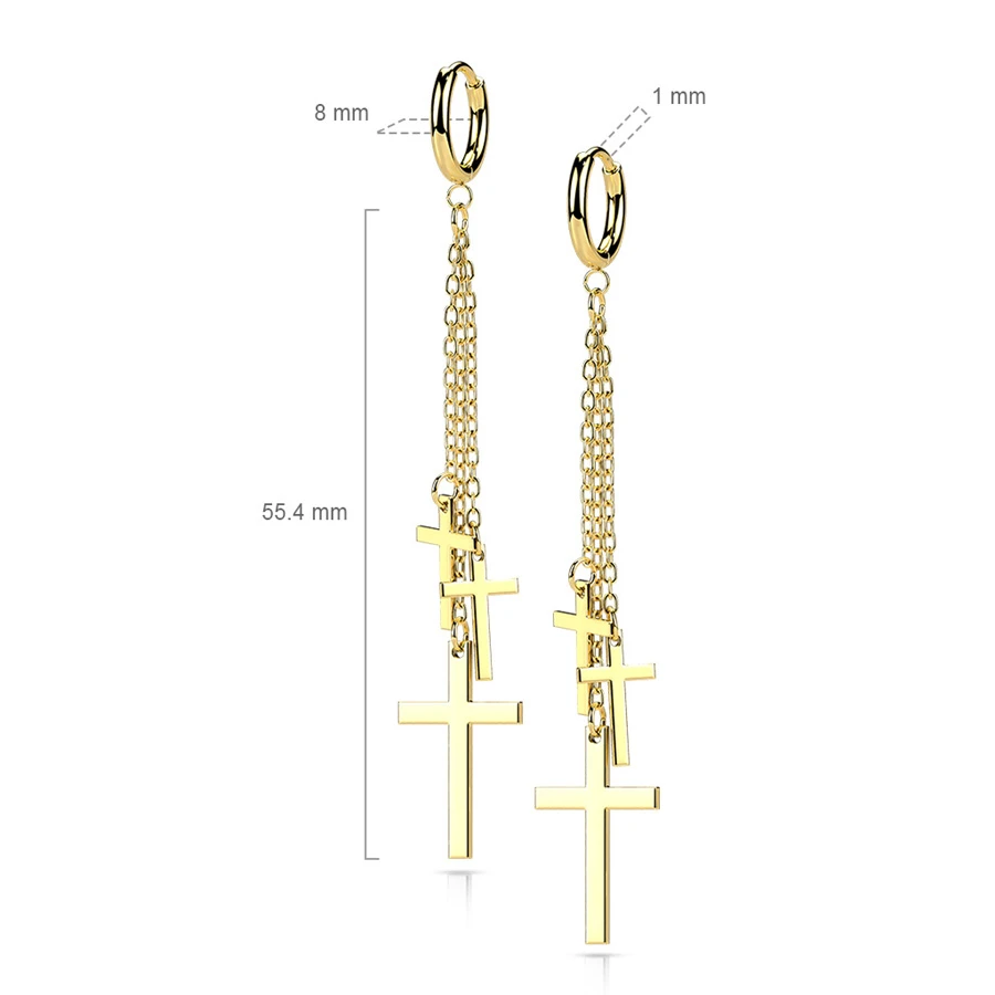 Visací náušnice s křížky. Jako všechny šperky z chirurgické oceli jsou i tyto náušnice kroužky odolné proti poškození, nevyvolávají alergické reakce, neoxidují a nemění barvu. Především pro tyto vlastnosti jsou ocelové náušnice stále vyhledávanými šperky.