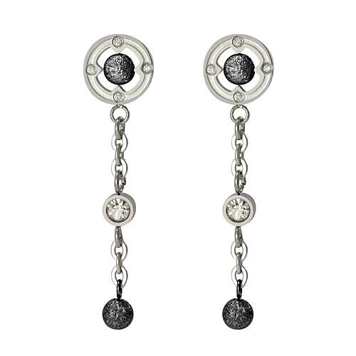 Náušnice z oceli 316l. Povrch je kombinace lesk-mat. Vrchní část náušnic má průměr 9mm, ozdoba se zirkonem 4mm, kulička na konci má průměr 4mm. Délka náušnic 36mm. Zapínání je na puzetku. Uvedená cena za 1 pár.