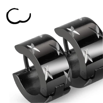 Náušnice z chirurgické oceli 316L. Náušnice mají černou PVD barvu. Po obvodě náušnic jsou vybroušené znaky tvaru x. Vnitřní průměr náušnic 9mm, šířka náušnic 7mm. Uvedená cena za 1 pár.