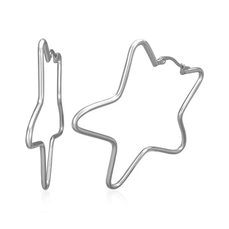 Náušnice z chirurgické oceli 316L. Náušnice s leštěným povrchem. Náušnice mají tvar hvězdy. Náušnice jsou široké 2mm. Rozměr náušnic: 43*43mm.