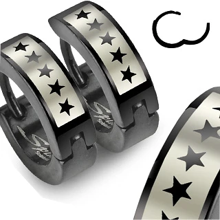 Náušnice z chirurgické oceli 316L. Náušnice mají černou PVD barvu. Náušnice jsou ozdobené hvězdami. Vnitřní průměr náušnic 9mm, šířka náušnic 4mm. Uvedená cena za 1 pár.