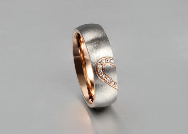 Snubní prsteny z chirurgické oceli. Dámské snubní prsteny ozdobené zirkony jsou ve velikostech 49-57. Pánské snubní prsteny jsou s černou polovinou srdce ve velikostech 59-67. Snubní prstýnky široké 6 mm.