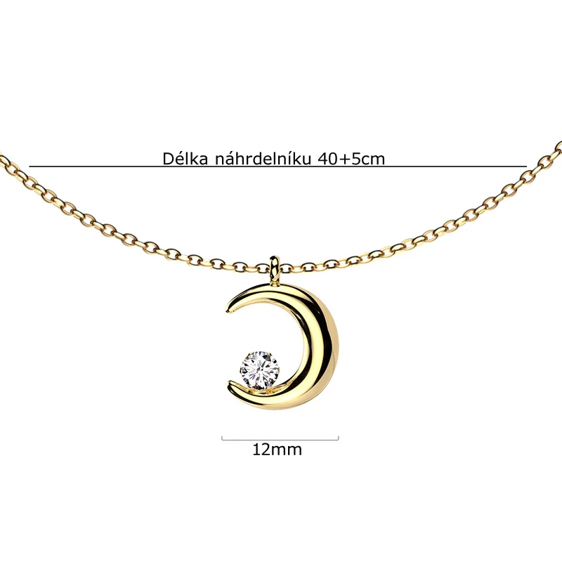 Náhrdelník z chirurgické oceli se zirkonem. Náhrdelník tvoří řetízek vzoru ankr a přívěsek ve tvaru srpku měsíce. Řetízek má průměr 0,9mm, průměr přívěsku 12mm. Zapínání náhrdelníku je karabinové, délku náhrdelníku lze nastavit v rozmezí 40-45cm.