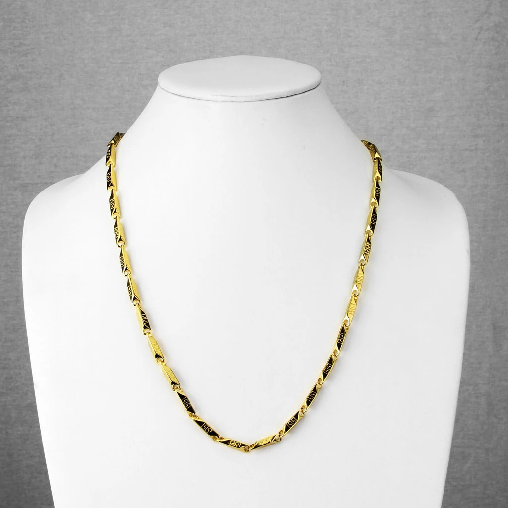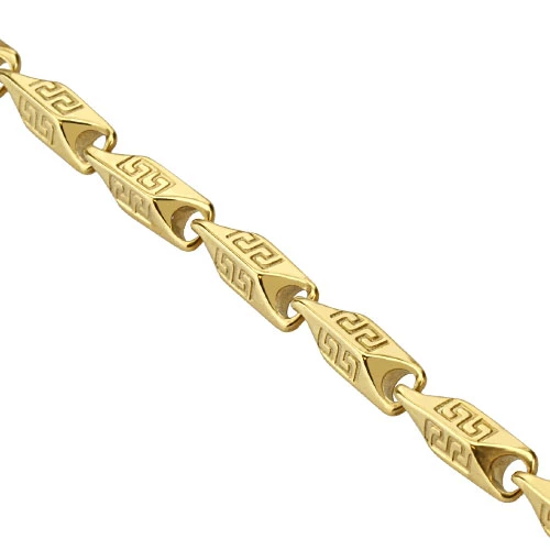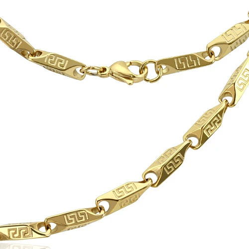 Náhrdelník z chirurgické oceli s leštěným povrchem upraveným zlatou IP barvou. Řetízek má karabinové zapínání. Rozměr článku 4x4x18 mm. Délku náhrdelníku 60 cm je možné na přání zdarma zkrátit.