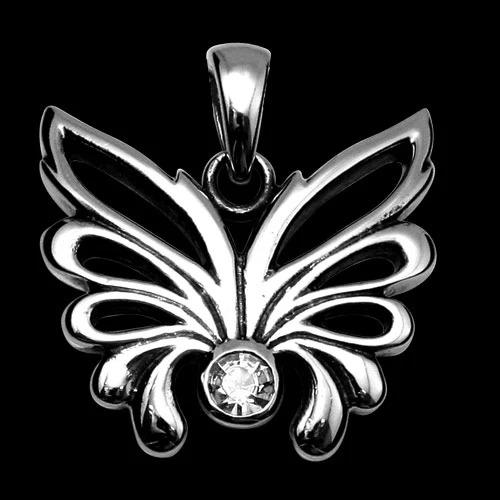 Přívěsek odlitý z chirurgické oceli 316L. Povrch přívěsku je leštěný. Přívěsek je zdobený zirkonem. Přívěsek svým tvarem napodobuje motýla. Rozměr přívěsku 20*23mm.