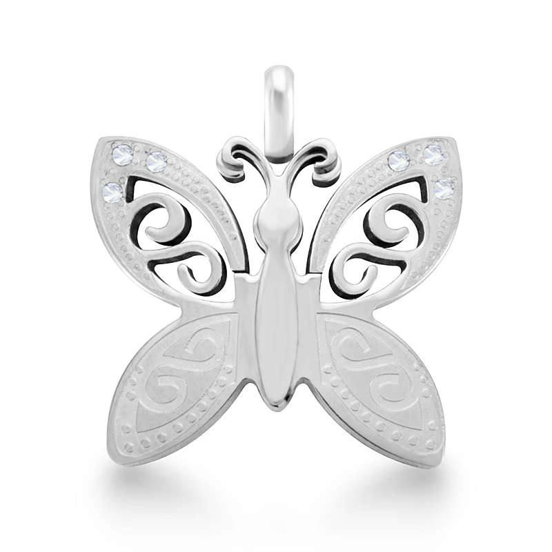 Přívěsek z chirurgické oceli 316L. Přívěsek má leštěný povrch se zirkony. Tvar přívěsku připomíná motýla. Přívěsek má rozměr 26*25mm. Hezký přívěsek z chirurgické oceli 316L.