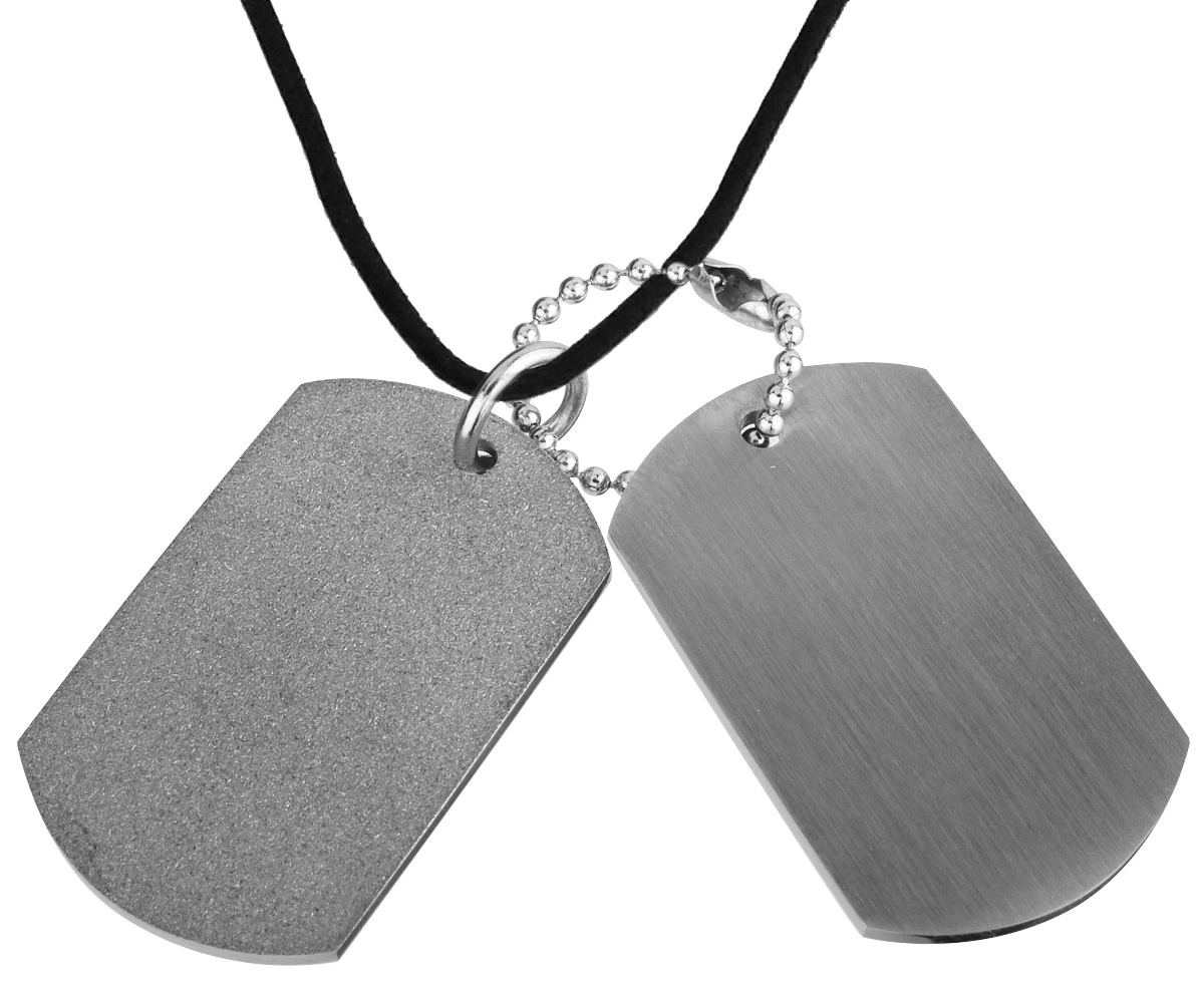 Přívěsek z chirurgické oceli 316L. Psí známky. Povrch obou přívěsku je matný, povrch jedné známky je z poloviny pískovaný. Rozměr známek 31*19mm. Do přívěsku je možné zajistit rytinu.