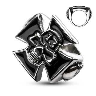 Prsten z chirurgické oceli 316L.Povrch prstenu je leštěný kombinovaný s černou. Masivní ocelový prsten s maltézským křížem. Uprostřed maltézského kříže je lebka s číslem 13. Na obou stranách obroučky prstenu jsou plastiky lebek. Maltézský kříž má rozměr 27*27mm. Obruba prstenu je u maltézkého kříže široká 16mm a postupně se zužuje na 6mm. Opravdu masivní prsten z chirurgické oceli s lebkou.