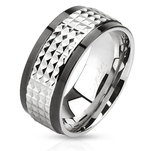 Prsten z chirurgické oceli 316l. Povrch prstenu je leštěný. Prsten má po stranách černé proužky. Prsten je široký 9mm. Hezký pánský ocelový prsten.