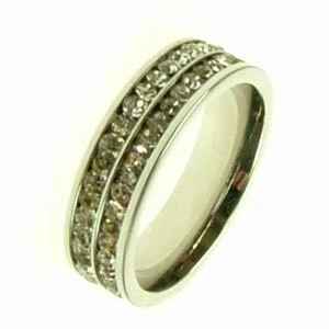 Prsten vyrobený z chirurgické oceli. Prsten je dokola ozdoben zirkony ve dvou řadách. Pěkný elegantní prsten. Prsten je široký 6mm.