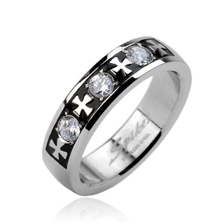 Prsten z chirurugické oceli 316L. Prsten má leštěný povrch kombinavaný s černou IP barvou doplněný zářivými zirkony. Prsten má motiv maltézského kříže. Prsten je široký 6mm.