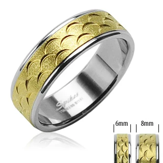 Prsten z chirurgické oceli 316L. Prsten má pozlacený povrch s leštěnými linkami na krajích. Ve velikostech 49–57 je prsten široký 6mm, ve velikostech 59–73 je prsten široký 8mm. Lze použít jako snubní prsteny.