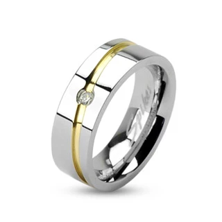 Prsten z chirurgické oceli 316L. Prsten má leštěný povrch. Prsten má po obvodě zlatý proužek. Prsten je ozdobený zirkonem. Šíře prstenu 6mm. Prsten je možné použít jako snubní.