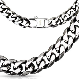 Řetízek z chirurgické oceli 316L. Povrch řetízku je leštěný. Řetízek má „zkosené“ hrany. Délka řetízku 60cm, šířka 10mm. Zapínání řetízku je karabinové. Pěkný pánský řetízek klasického vzoru. Délku řetízku lze na přání zdarma zkrátit.