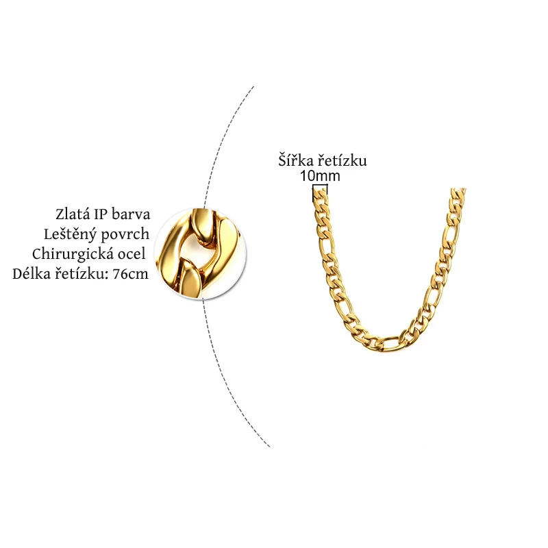 Řetízek z chirurgické oceli s leštěným povrchem upraveným zlatou IP barvou. Zapínání řetízku je karabinové. Šířka řetízku 10mm. Délku řetízku je možné na přání zdarma zkrátit.