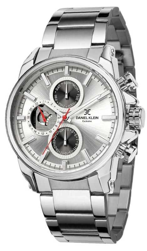 Masivní pánské náramkové hodinky Daniel Klein. Kovové pouzdro hodinek má stříbrnou barvu. Hodinky mají multifunkčního ukazatele data, celých hodin a dne v týdnu, vteřinovou, minutovou a hodinovou ručku. Kovový tah se skládacím zapínáním s pojistnou pružinkou. Rozměr pouzdra 44×47mm, kovový tah je široký 18mm.