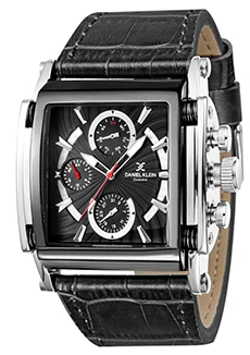 Masivní pánské náramkové hodinky Daniel Klein. Kovové pouzdro hodinek má černou barvu. Hodinky mají multifunkčního ukazatele data, celých hodin a dne v týdnu, vteřinovou, minutovou a hodinovou ručku. Černý kožený řemínek se zapínáním na jednoduchou sponu má perforovaný povrch. Rozměr pouzdra 53×45mm, kožený pásek je široký 32mm. Pohon hodinek zajišťuje spolehlivý bateriový strojek.