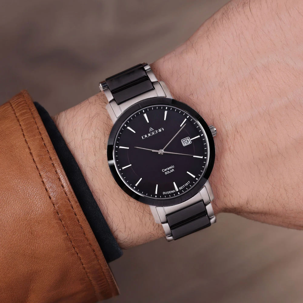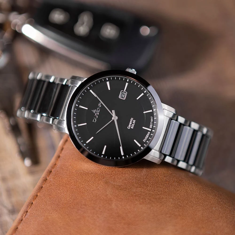 Hodinky pro muže od Německého výrobce Dugena. Pánské náramkové hodinky kombinující ušlechtilou ocel s keramikou. Hodinky jsou vybavené ukazatelem data, hodinovou, minutovou a vteřinovou ručkou. Černý ciferník s indexy. Pouzdro hodinek má průměr 40mm. Provoz hodinek zajišťuje spolehlivý strojek na solární pohon. Hodinky jsou dodávané v originální krabičce s logem Dugena. Tyto pánské hodinky jsou voděodolné na úrovni 5 ATM.