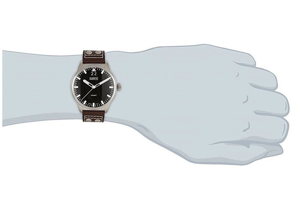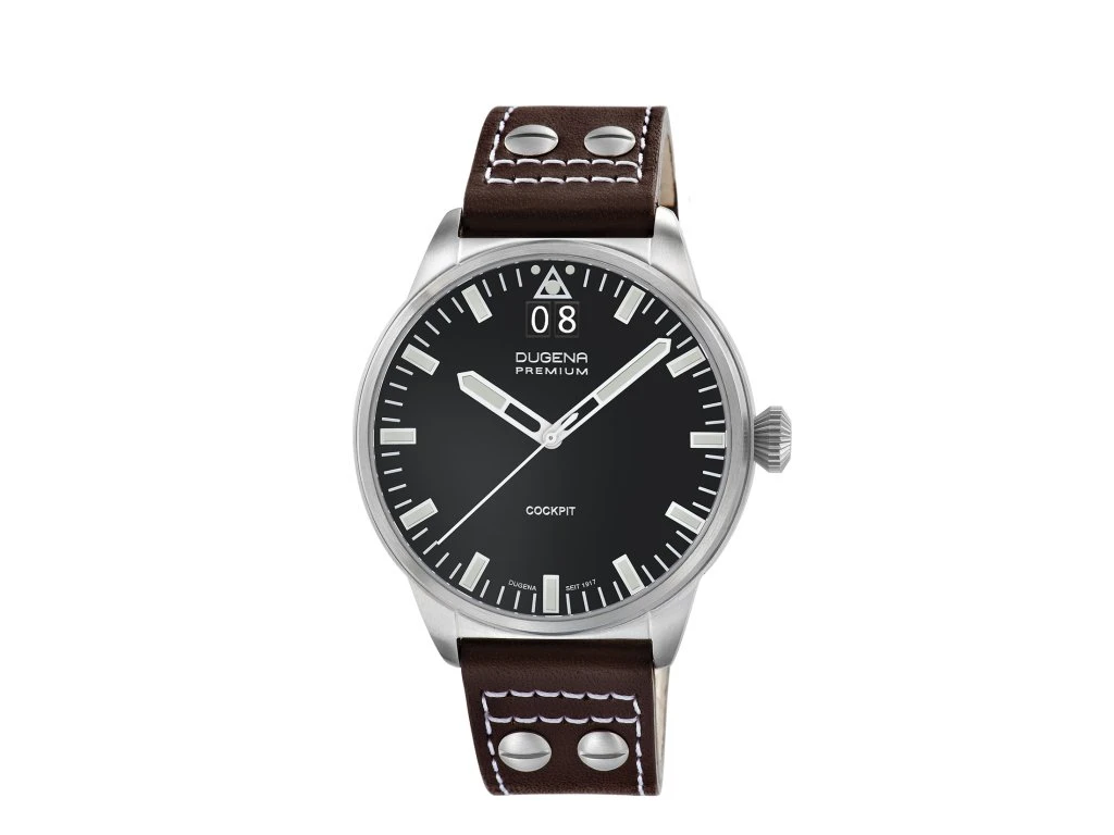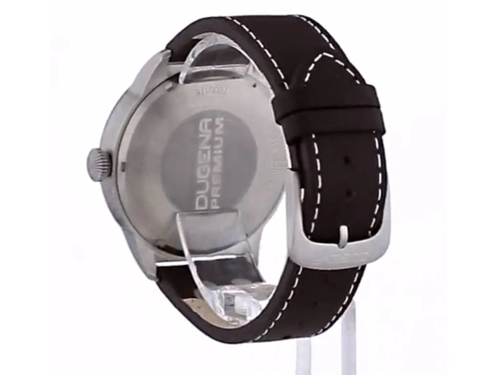 Pánské náramkové hodinky Dugena z chirurgické oceli s koženým řemínkem se zapínáním na přezku, sklíčko hodinek je safírové. Kulatý černý ciferník s indexy. Hodinky jsou vybavené datumkou, hodinovou, minutovou a vteřinovou ručkou. Průměr pouzdra hodinek 45mm, výška pouzdra 13mm. Pouzdro hodinek je vyrobené z leštěné chirurgické oceli. Chod hodinek zajišťuje spolehlivý bateriový strojek. Hodinky jsou vodotěsné na úrovni 5 ATM. Na všechny hodinky Dugena platí záruka v délce 36 měsíců. Hodinky jsou dodávané v dárkové krabičce s logem.