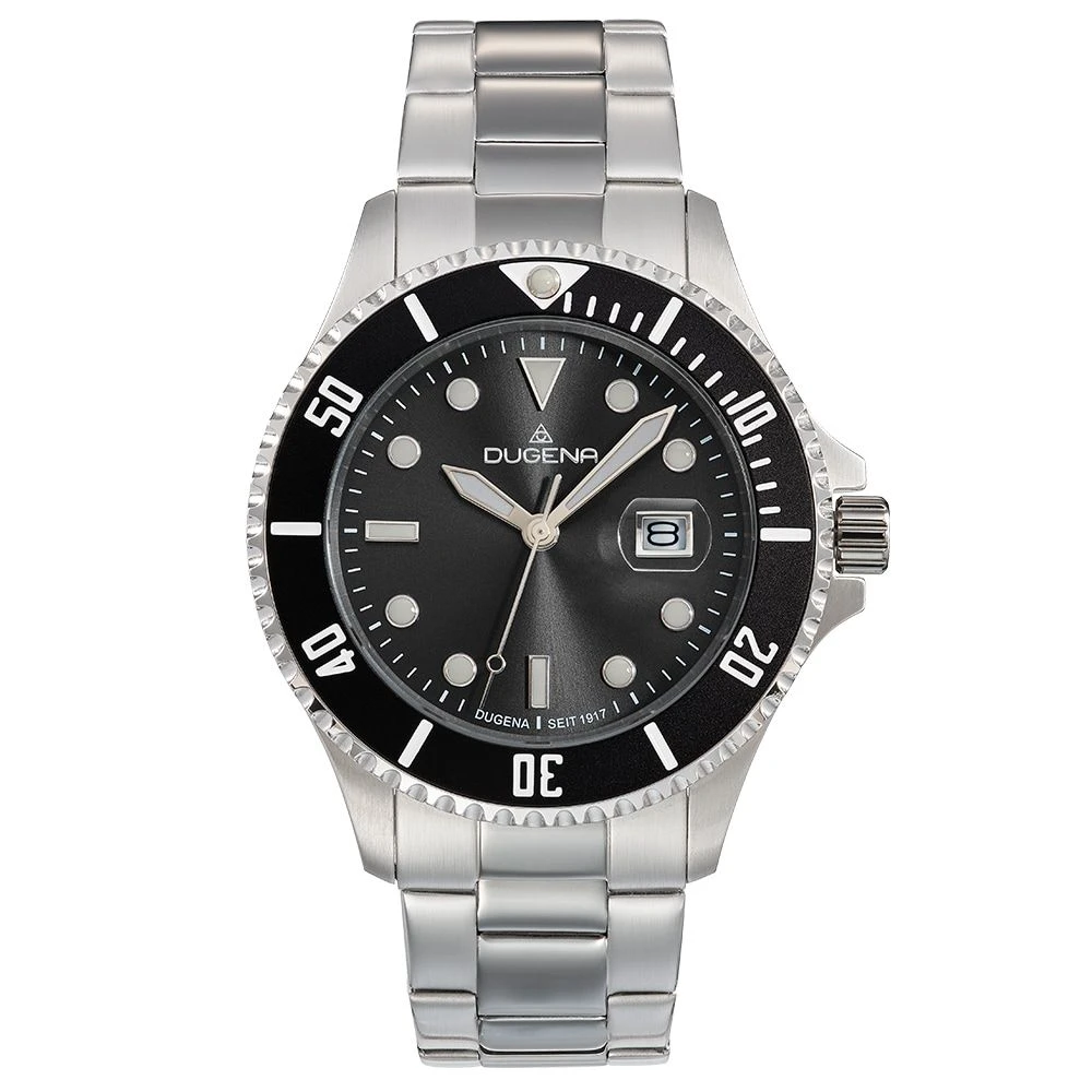 Sportovní hodinky pro muže od Německého výrobce Dugena. Pánské náramkové hodinky pro vodní sporty. Hodinky jsou vybavené ukazatelem data, hodinovou, minutovou a vteřinovou ručkou. Černý ciferník s indexy. Nad datumkou je pro lepší čitelnost v minerálním sklíčku lupa. Pouzdro hodinek má průměr 44mm, výška pouzdra 12mm. Provoz hodinek zajišťuje spolehlivý bateriový strojek. Hodinky jsou dodávané v originální krabičce s logem Dugena. Tyto pánské hodinky jsou voděodolné na úrovni 30 ATM.