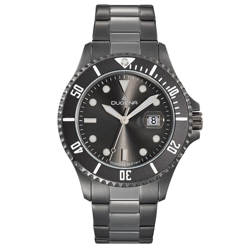 Sportovní hodinky pro muže od Německého výrobce Dugena. Pánské náramkové hodinky pro vodní sporty. Hodinky jsou vybavené ukazatelem data, hodinovou, minutovou a vteřinovou ručkou. Antracitový ciferník s indexy. Nad datumkou je pro lepší čitelnost v minerálním sklíčku lupa. Pouzdro hodinek má průměr 44mm, výška pouzdra 12 mm. Provoz hodinek zajišťuje spolehlivý bateriový strojek. Hodinky jsou dodávané v originální krabičce s logem Dugena. Tyto pánské hodinky jsou voděodolné na úrovni 30 ATM.