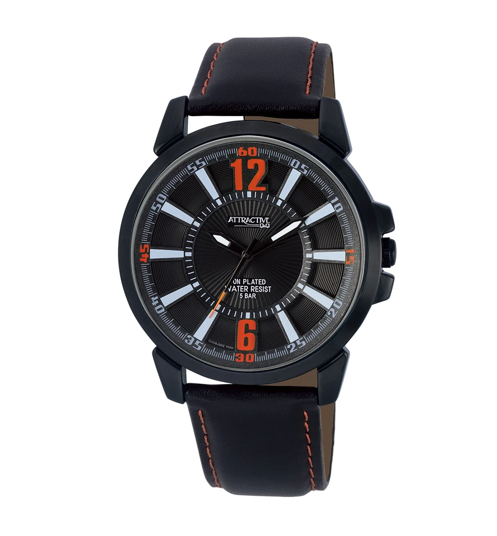 Hodinky Q+Q. Hodinky mají černý ciferník, hodinovou, minutovou a vteřinovou ručku. Ciferník má průměr 38mm. Kovové pouzdro má průměr 43mm. Kožený řemínek prošitý oranžovou nití je široký 22mm. Řemínek se zapíná pomocí jednoduché spony. Strojek pohánějící hodinky je bateriový značky Miyota. K hodinkám obdržíte plastovou krabičku.