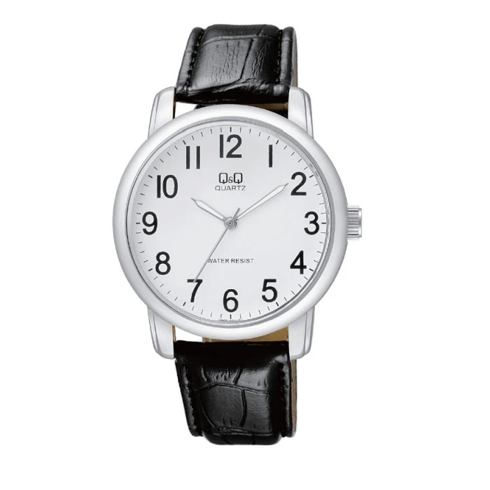 Náramkové hodinky pánské Q+Q. Provoz zajišťuje spolehlivý bateriový strojek Miyota. Černý pásek z umělé kůže. Hodinky mají hodinovou, minutovou a vteřinovou ručičku. Průměr ciferníku 34mm, průměr kovového pouzdra 40mm. Řemínek je široký 20mm. Hodinky jsou dodávané v plastové krabičce s průhledným víčkem.