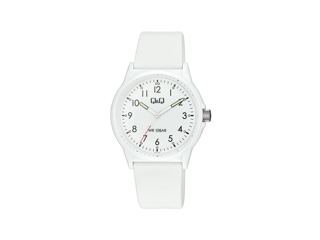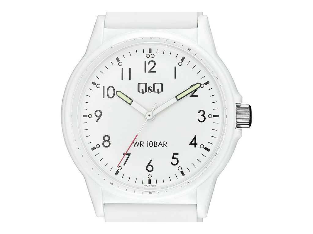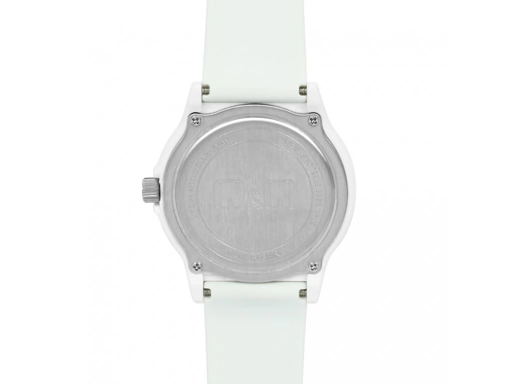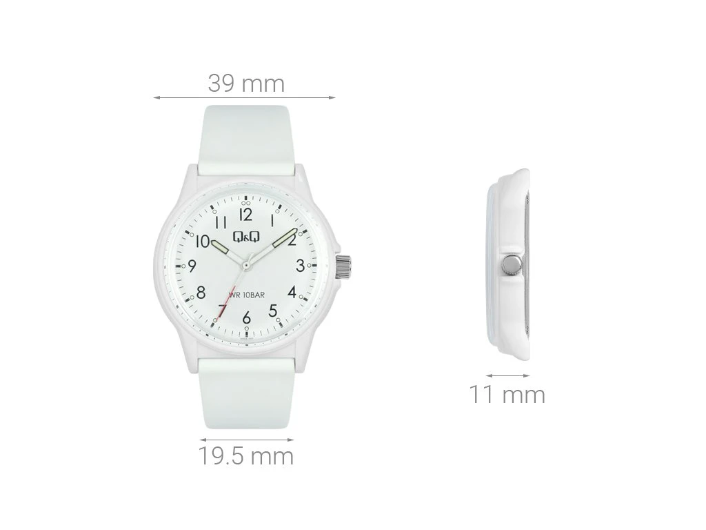 Náramkové hodinky pro muže. Hodinky mají plastové pouzdro i řemínek. Pouzdro hodinek má průměr 39mm, tloušťka pouzdra 11mm. Bílý ciferník s černým číselníkem má průměr 34mm. Hodinky jsou vybavené hodinovou, minutovou a vteřinovou ručkou. Hodinová a minutová ručka svítí ve tmě. Plastový řemínek se zapínáním na jednoduchou sponu je široký 18mm. Hodinky jsou vodotěsné na úrovni 10ATM. Hodinky pohání spolehlivý bateriový strojek. Hodinky jsou dodávané včetně dárkové krabičky.